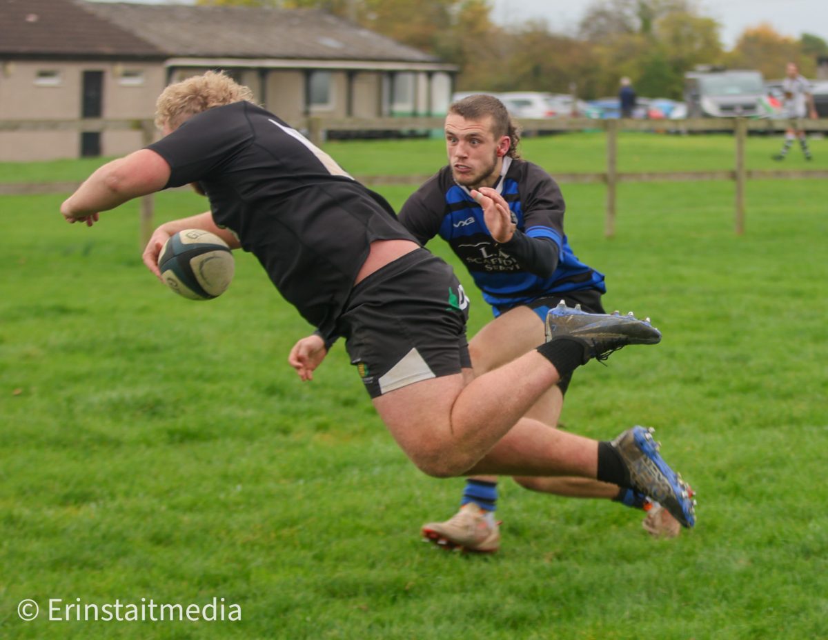 Playing up the Ridings with a stiff breeze blowing, the Sods soon found themselves under pressure from a Dings side determined to bludgeon the defensive line with one-out runners. Some big tackling from forwards and backs, along with good kicking from James Bennett at 10 and Franklin Griffee at 15 kept the visitor out despite repeated attempts to score. The scrum was working well with go-forward on both our own and opposition ball and Freddie Nutt carrying well from the base, but the lineout struggled in the breeze and added to the pressure. Repeated attempts to break the Sodbury line ended in a series of knock-ons or turnovers and after 15 minutes it was still all square at 0-0 with Sodbury having hardly left their 22.